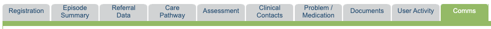 In the comms tab, you can send ad-hoc SMS messages, view a history of all SMS sent to a patient in a specific episode of care, and view all webforms sent to the patient in a specific episode of care.