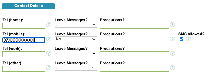 To send an SMS that isn’t an automated appointment SMS to the patient, you will need to ensure the patient has a valid mobile number and that the ‘SMS allowed’ button is ticked in the Patient Registration page.
