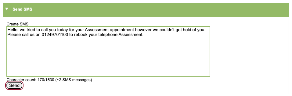 To send the SMS, simply type your message in this box. You will see that a character count will show at the bottom so you can see how many pages your SMS will be. Once you have finished composing your message, simply press ‘Send’.