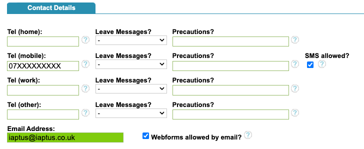 Depending on your iaptus Webform sending method, please ensure the patient has either a valid email address, and that the ‘Webforms allowed by email’ has been ticked, or a valid mobile number with the ‘SMS allowed’ button ticked in the Patient Registration tab.