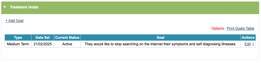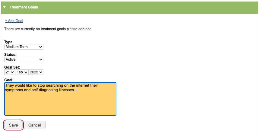 To add a treatment goal, you will need to complete the following fields