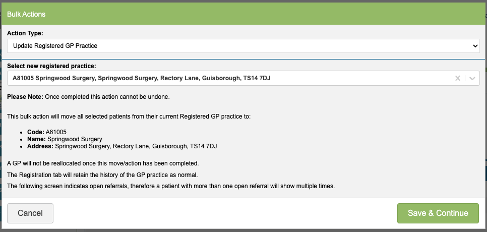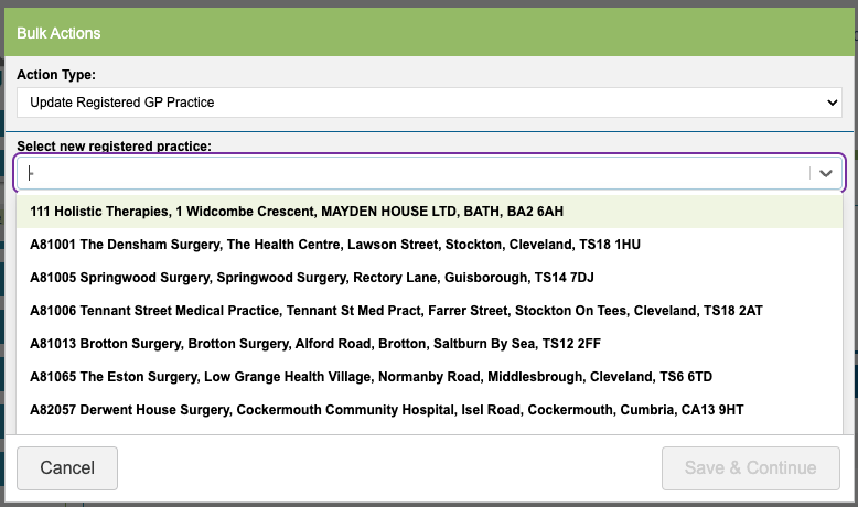 Select the ‘Update Registered GP Practice’ action type then search for the new GP Practice you wish to move the patients to.