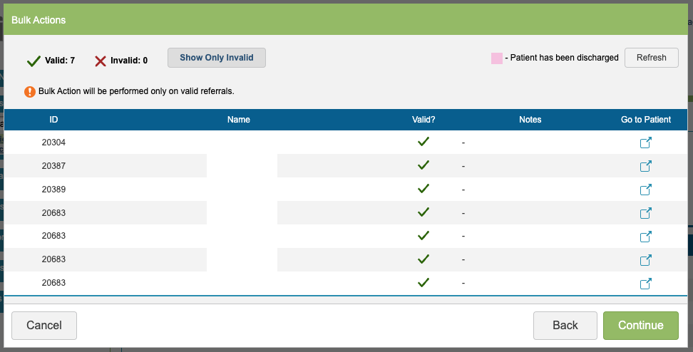 When you are happy with the action, click ‘Save & Continue’. The list of referrals will show if they are valid or invalid. For any invalid referrals where this action cannot be performed, the reason will be displayed in the ‘Notes’ column. There is also a link to go to the patient record if you wish to make any changes to the referral.