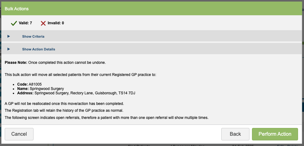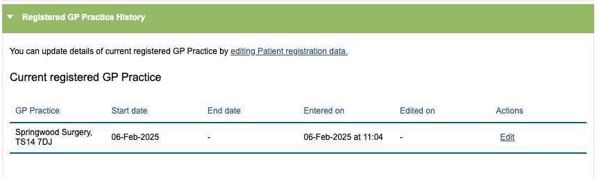 To complete the action, click ‘Perform Action’. The updated details will appear in the Registered GP Practice history table in the Patient Registration tab.