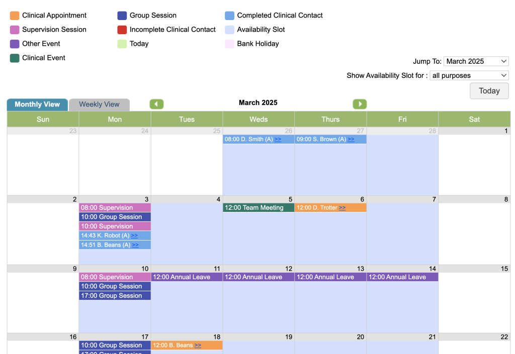 Also, when you click on the Diary icon you will be presented with diary of the therapist and are able to book availability, events and appointments on their behalf.