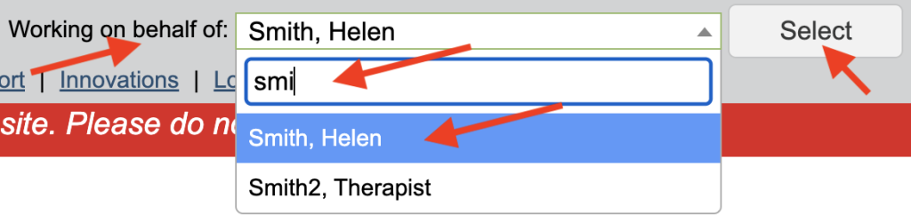 If you are an admin user, there is an additional section at the top, where you can specify the therapist you are working with. This allows you to view that therapist’s caseload and diary amongst other options.